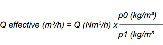 Le Normal m³ est considéré à une température de 0°C et à la pression atmosphérique au niveau de la mer. Sa masse volumique pour l’air est de ρ0 = 1,293 kg/m³. Pour la sélection du ventilateur il faut tenir compte de la masse volumique de l’air passant dans le ventilateur. Par exemple un débit de 1000 Nm³/h à une température de 20°C avec un ρ1 = 1,204 kg/m³ donne 1074 m³/h effectifs selon la formule..