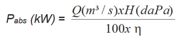 Het vermogen op de as is gelijk aan het nuttige vermogen aan de luchtstroom geleverd, gedeeld door het rendement van de ventilator.
