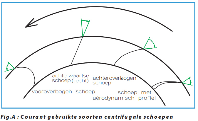 Bij een centrifugale ventilator, veroorzaken voorovergebogen schoepen een hogere druk bij een lager rendement in vergelijking met achterovergebogen schoepen.Voor industriële toepassingen wordt, onder druk van het vereiste rendement, massaal gebruik gemaakt van turbines met achterovergebogen schoepen.De schoepen zijn meestal vlak, of gebogen in één vlak om de kosten zo veel mogelijk te drukken. In uitzonderlijke gevallen kiest men voor een schoep in de vorm van een vliegtuigvleugel om het rendement te optimaliseren.