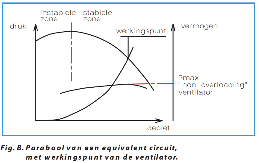 Het werkingspunt van een ventilator binnen een circuit is het punt bepaald enerzijds door de curve van de ventilator en anderzijds door de parabool van de drukverliezen in het circuit.