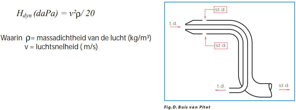 De dynamische druk kan bepaald worden door het verschil te meten tussen de totale en de statische druk,waarbij de uiteinden van dezelfde manometer in U-vorm aan elkaar worden verbonden. Dit principe wordt gebruikt door de buis van Pitot.De dynamische druk geeft een beeld van de luchtsnelheid en dus van het debiet.
