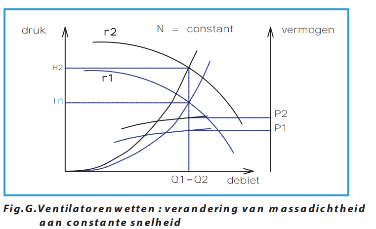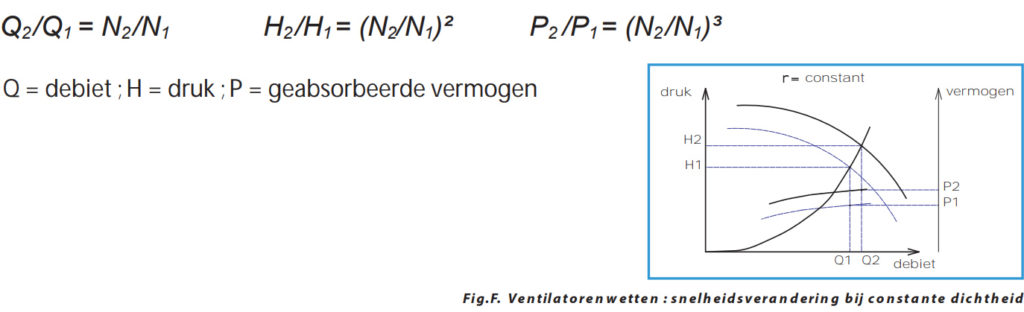 1/ Zonder het circuit te veranderen waarin de ventilator is geplaatst, en onder constante massadichtheid, verkrijgt men nieuwe werkingsvoorwaarden indien men de rotatiesnelheid van de ventilator verandert door van N1 (tr/min) over te schakelen naar N2. Deze voorwaarden beantwoorden aan de volgende wet :