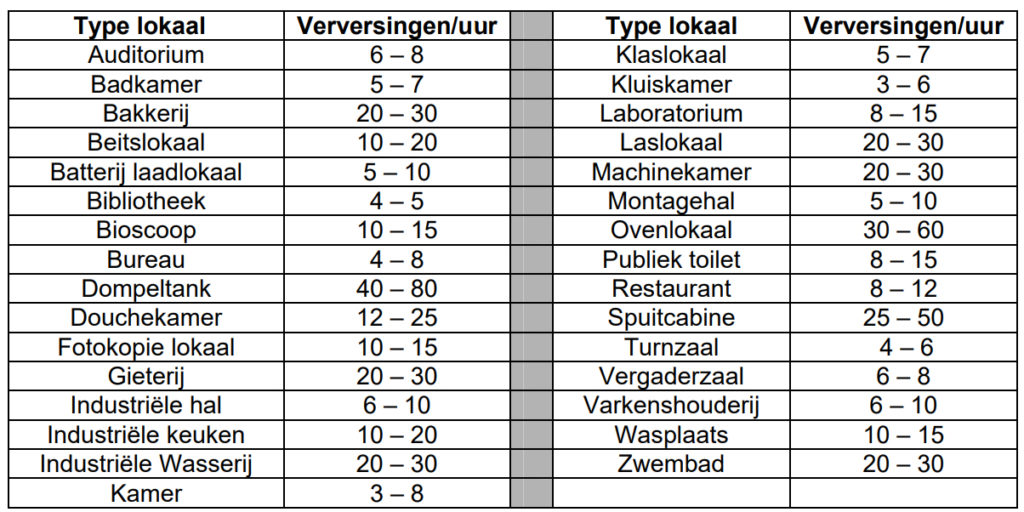 Q (debiet in m³/u) = volume lokaal m³ x aantal verversingen per uur