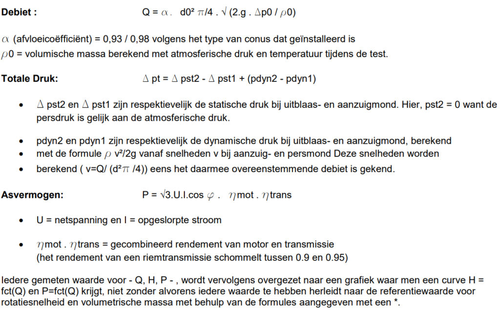 gekalibreerde aanzuigconus en een kruisstuk waartegen opeenvolgend metalen roosters worden bevestigd met een steeds kleiner rastermaas (” twistscreen “) die een steeds groter wordend drukverlies simuleren. Zodoende kan men zich verplaatsen naar verschillende punten op de curve van de ventilator. Een waarneming van statische druk Dp0 zal het debiet weergeven, terwijl Dpst de statische druk aan de ingang van de ventilator weergeeft.