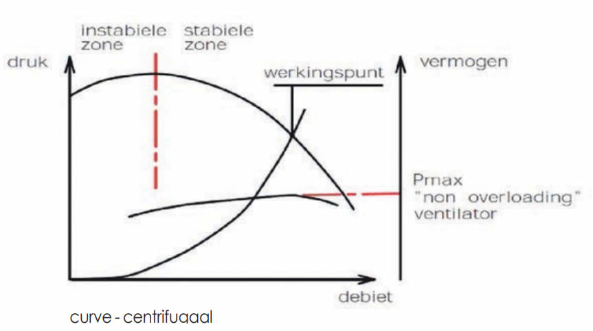 De verleiding om een kleinere machine te kiezen, goedkoper in aanschaf maar met een slecht rendement, is groot, maar zal u op lange termijn duur komen te staan. Kies geen ventilator die al van bij het begin helemaal rechts op de curve werkt.