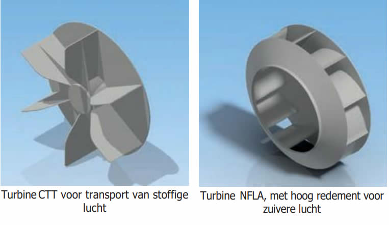 Bij een centrifugale ventilator produceert een voorwaarts gebogen turbine meer druk, maar werkt het met een lager rendement dan een achterwaarts gebogen turbine. Voor industriële toepassingen impliceert